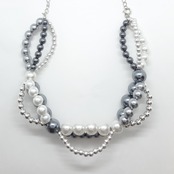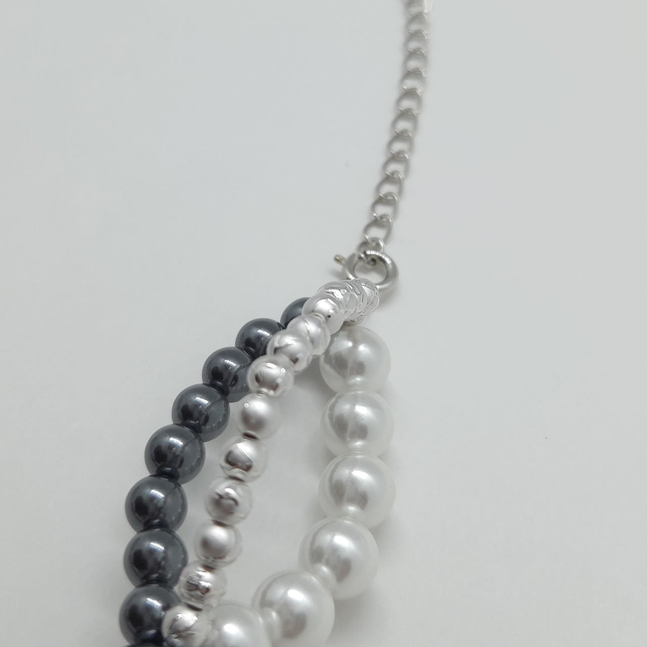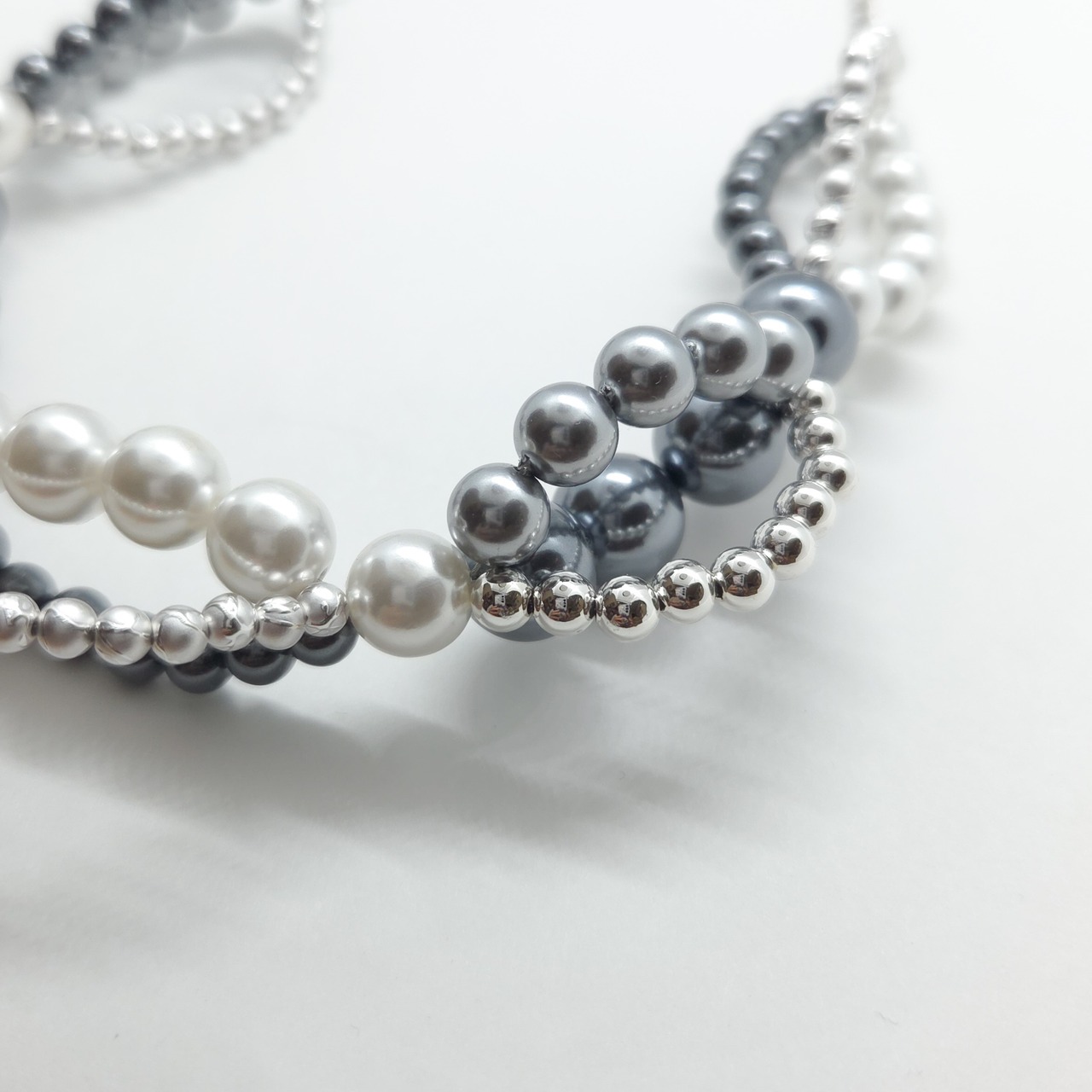 「がらくた」を集めたかのようないろんなサイズ、カラーのパールを組み合わせたネックレス。モノトーンなカラーでさまざまなスタイルにマッチします。