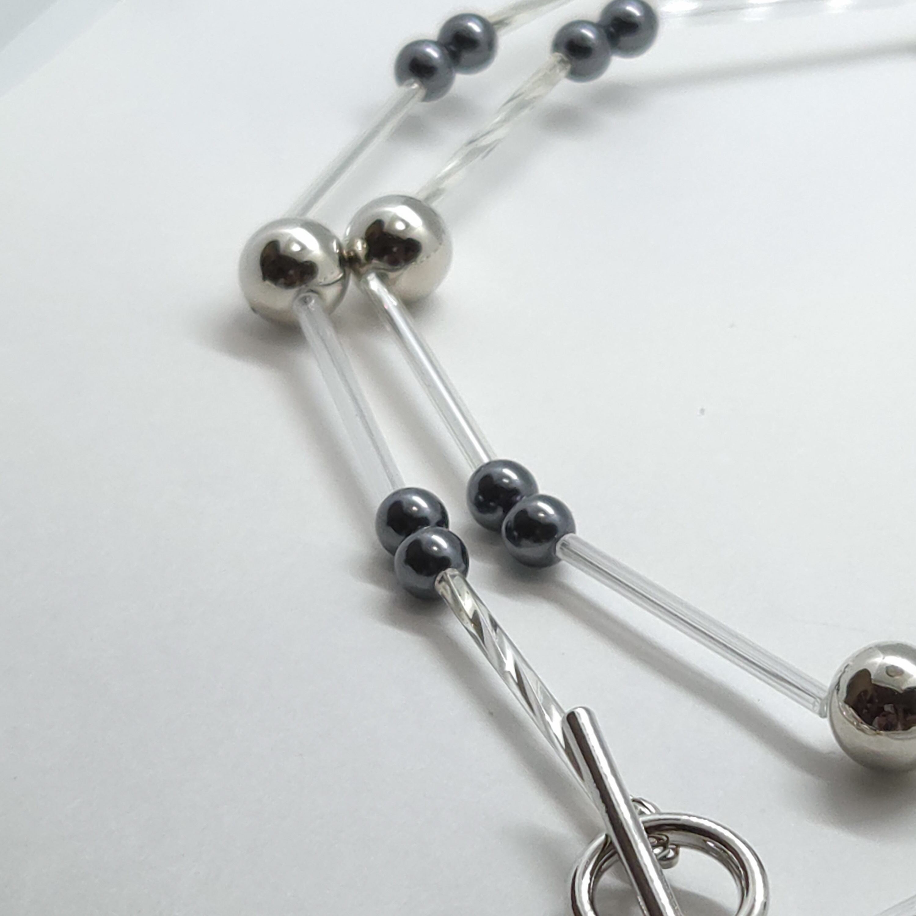 チョーカータイプで使用したり、一連でロングネックレスで使ったりとアレンジ次第で幅広く楽しめるネックレス。透明のパーツが抜け感をプラスします。